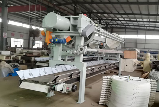 過濾、輸送壓濾機是在壓濾機濾板下方裝置了皮帶輸送,用于輸送濾板拉開時卸下的濾餅。該裝置適用于不易做基礎的工作現場,可以把物料輸送到指定的地方,減輕了員工勞動強度。